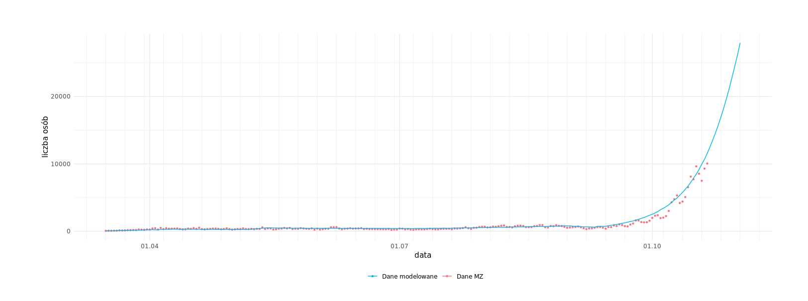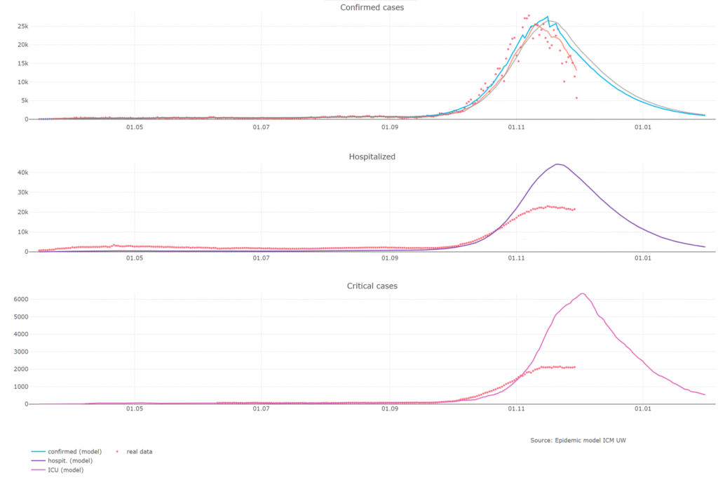 We also present the number of people requiring hospitalization and the use of a respirator. Our forecasts were calibrated to the numbers observed with excess beds and covid respirators. Currently, as you know, these places are managed in a much more economical way – that is why our curves run above the curves of the observed data. This forecast does not include changes to the restrictions planned after November 28 – in a slightly artificial way we assume that the last set of restrictions is the Responsibility Stage and will apply indefinitely, which of course cannot be the case.