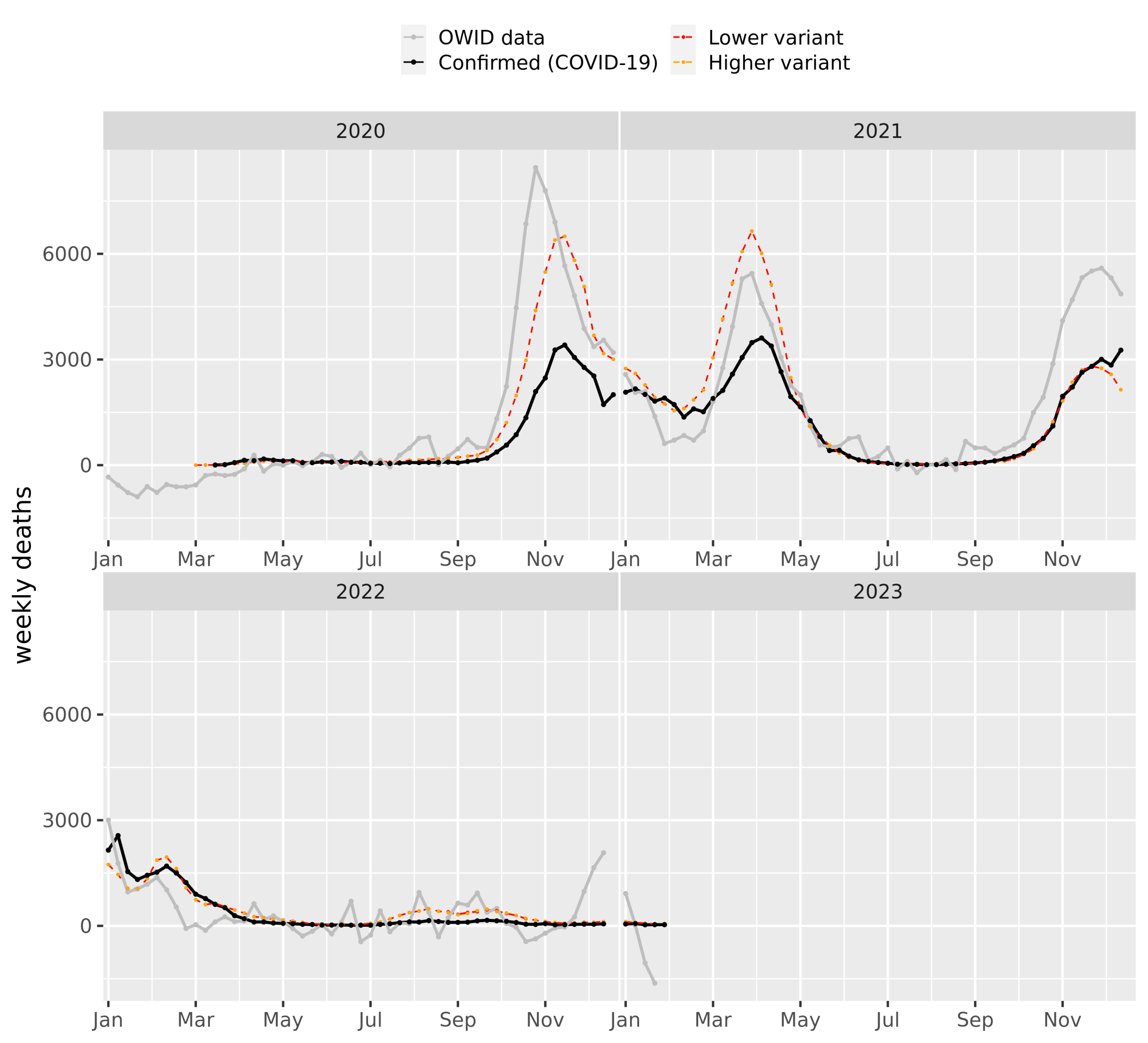The plot below shows weekly deaths in our model, confirmed COVID-19 deaths and excessive number of deaths based on OWID data.