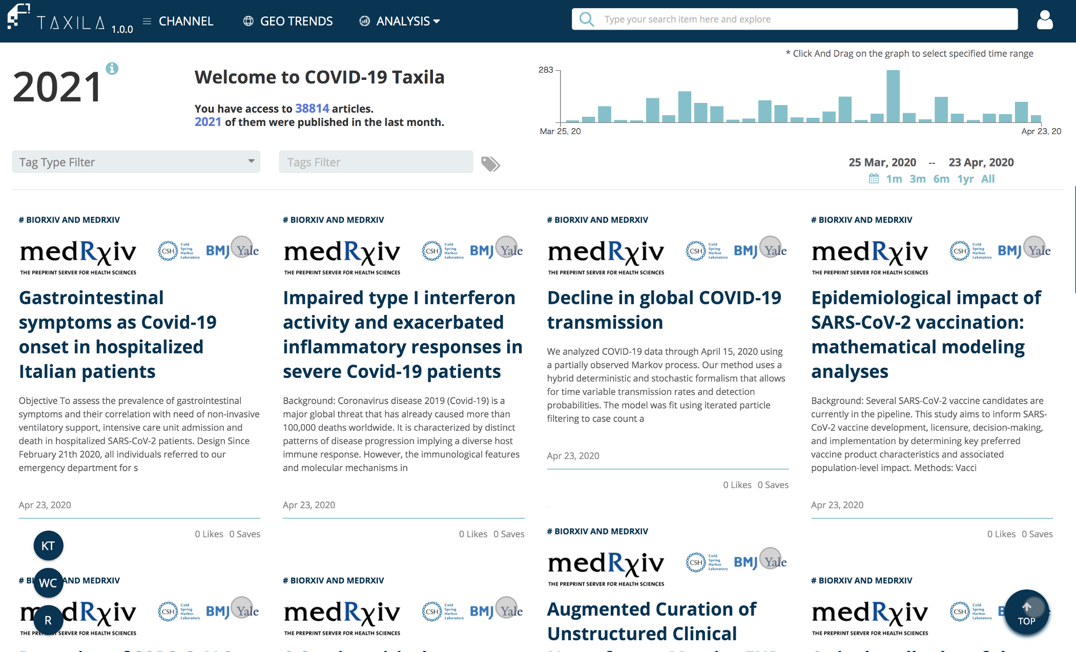 Podczas spotkań prezentowany był framework COVID-19-Taxila, który codziennie zbierał, gromadził oraz porządkował informacje o COVID-19 z różnych źródeł, m.in. z PUBMED, Arxiv, ClinicalTrials.gov czy z otwartych zbiorów danych badawczych COVID-19. Poprzez konkretne przypadki użycia i praktyczne podejście, naukowcy z SBI prezentowali uczestnikom warsztatów w jaki sposób poruszać się po Taxila oraz jak używać konkretnych modułów analitycznych do szybkiego uzyskiwania praktycznych informacji.